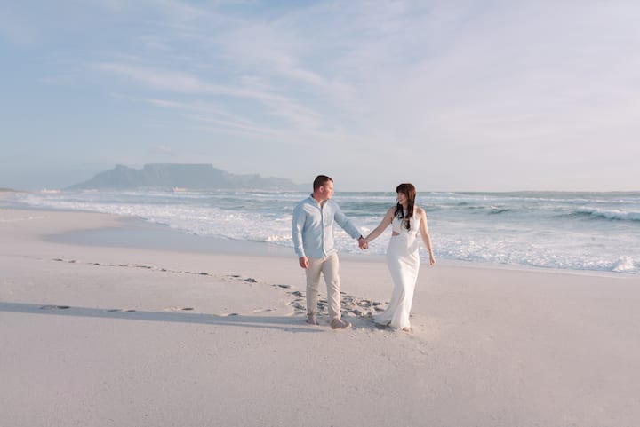 Sesión de fotos privada y relajada en la playa de Holbaai con la emblemática montaña de la Mesa como telón de fondo. Incluye 25 imágenes editadas y una sesión de una hora. Te guiaré para que tus retratos sean lo más naturales posible.
