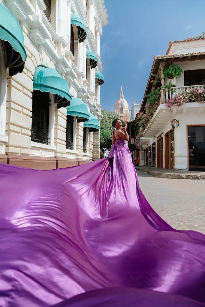 Vive una sesión de fotos inolvidable con un vestido de cola larga que ondea con el viento y te hará sentir como en una película. Ideal para celebrar momentos especiales y llevarte un recuerdo único de Cartagena.