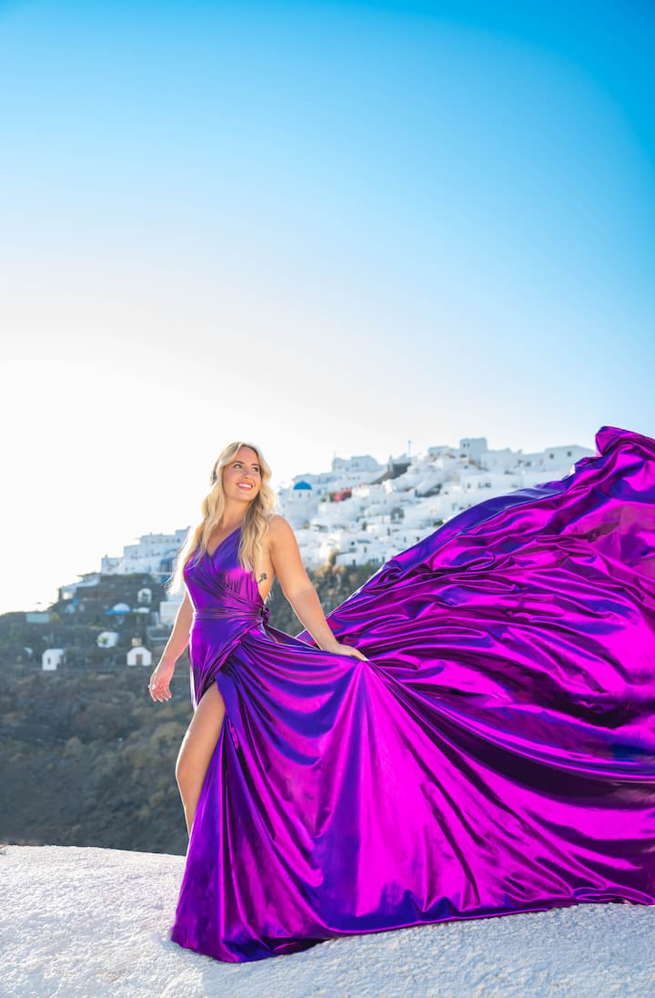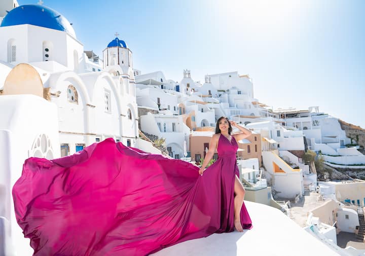 Disfrutá de una sesión de fotos con un vestido que vuela, junto a un equipo profesional con más de 15 años de experiencia. Te vamos a fotografiar en los lugares más emblemáticos de Santorini, con al menos 3 vistas impresionantes para obtener resultados perfectos.