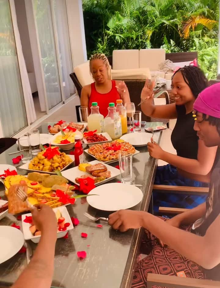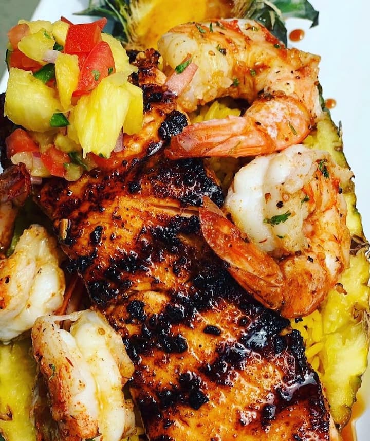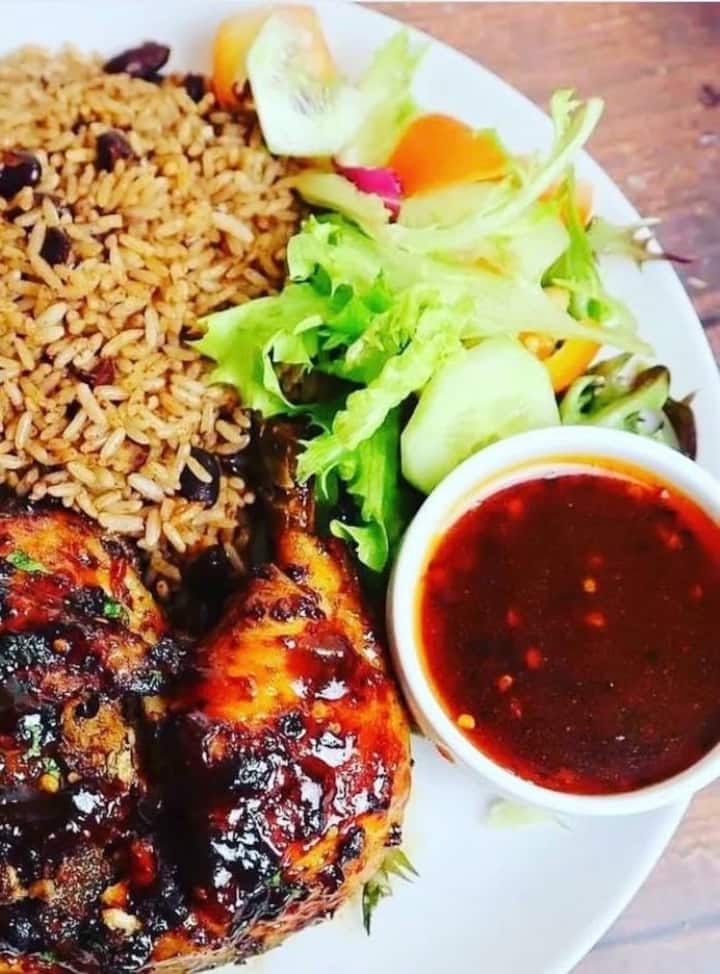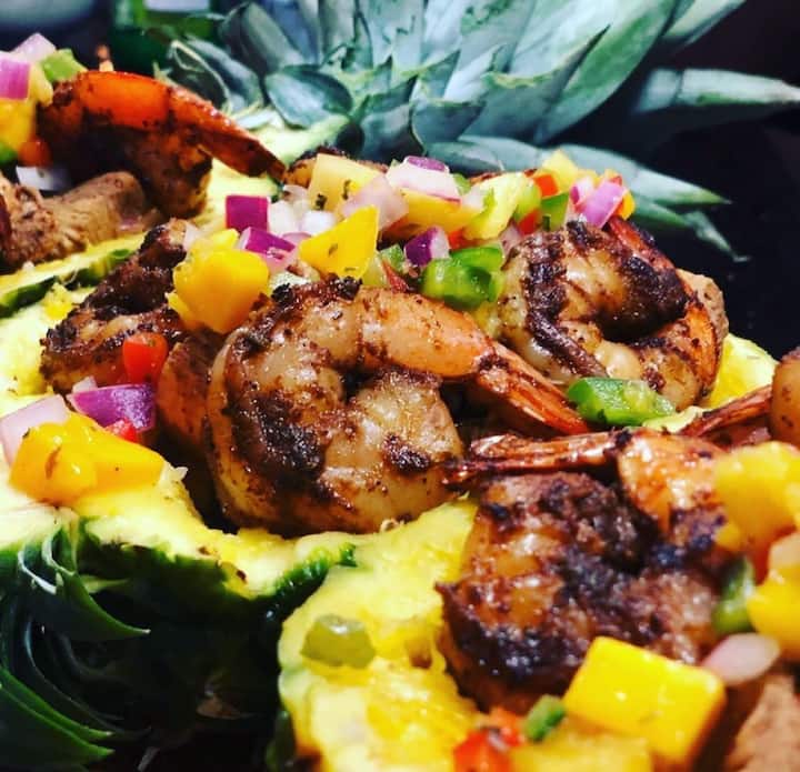 Disfruta de una variedad de platos como pollo jerk, pescado frito entero, salmón, arroz y guisantes, mac 'n' queso y tazones de piña. Una comida cálida y familiar. El desayuno puede incluir waffles y pollo frito, huevos, tocino, salchichas, papas o hash browns, fruta.