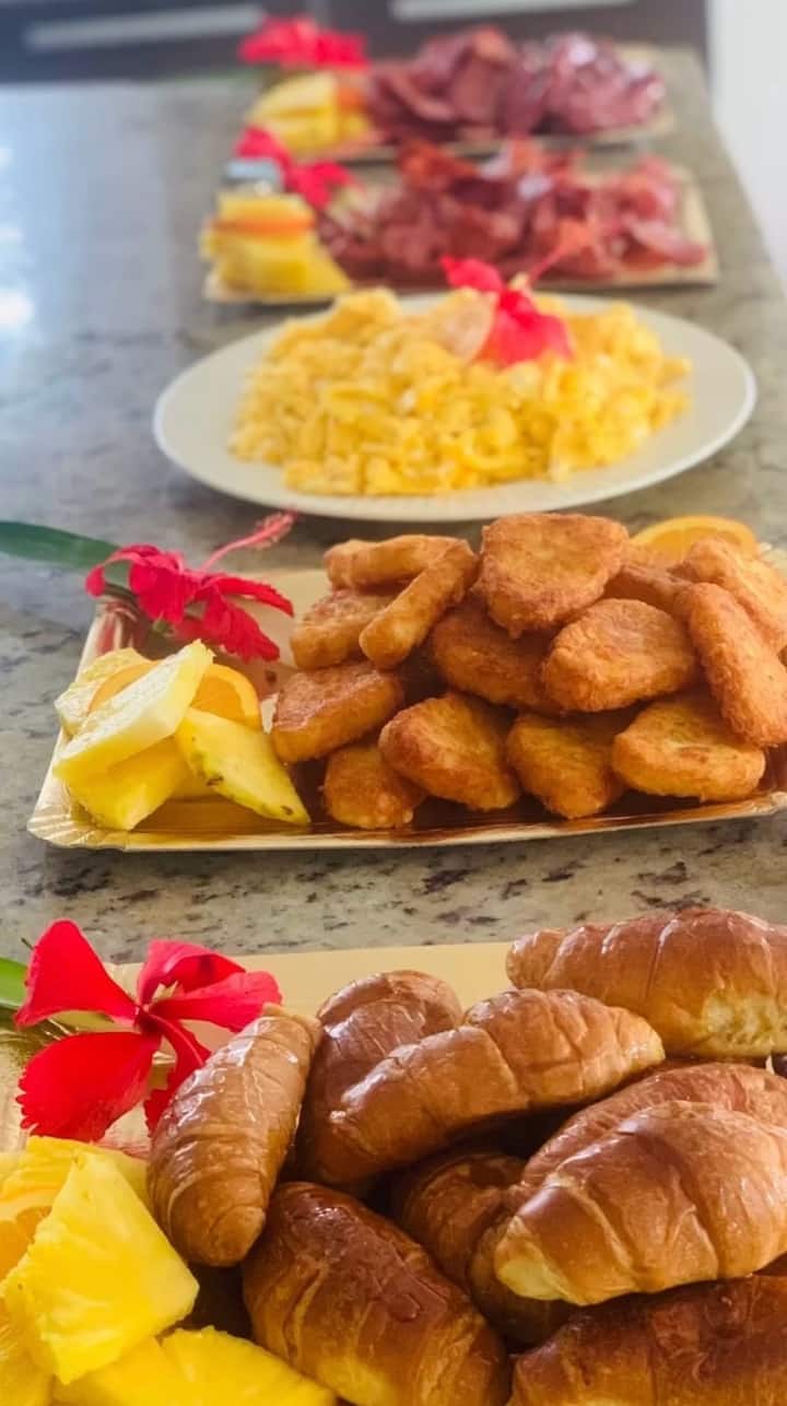 Elige entre un desayuno continental básico con cruasanes, magdalenas, pasteles, huevos, tocino, o un almuerzo con tacos, arroz y frijoles o una cena con pollo al estilo «jerk», arroz y plátano.