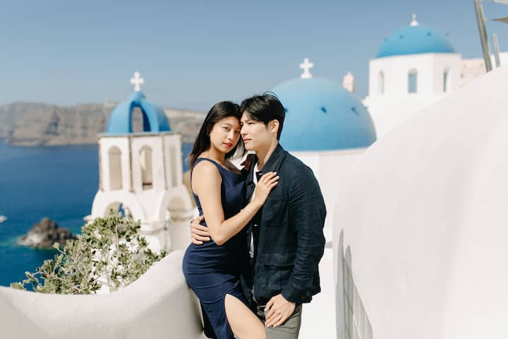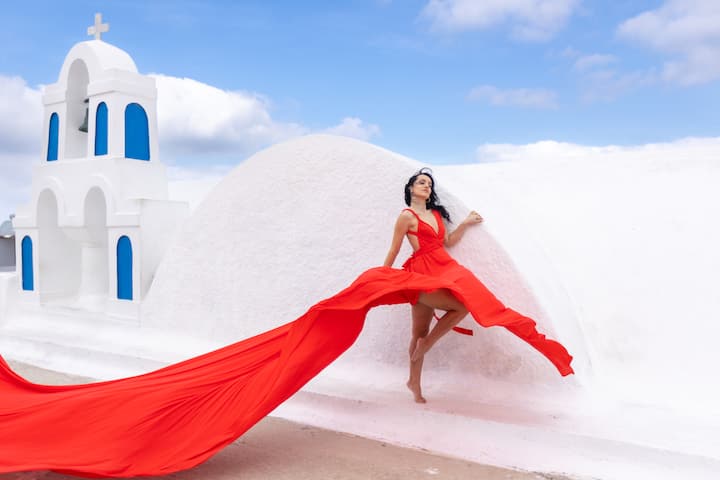 Disfruta de una mágica sesión de fotos de 1 hora en la impresionante Oia, donde llevarás un vestido volador que fluye para tomar fotos de ensueño y elegantes en el emblemático telón de fondo de Santorini.
