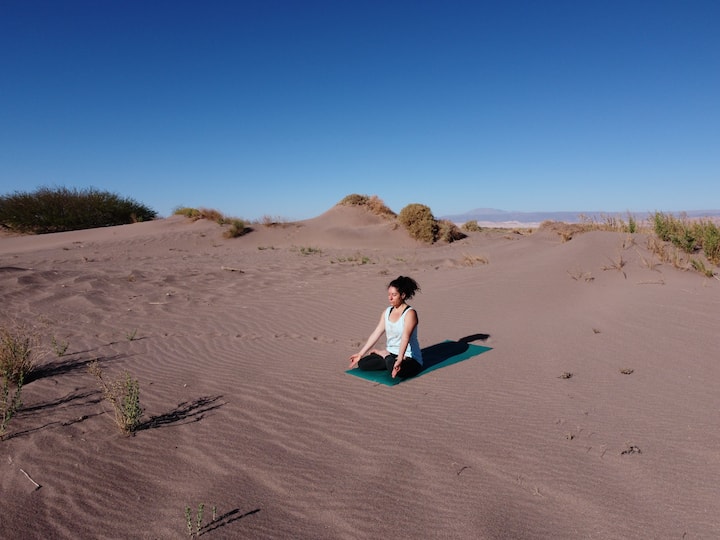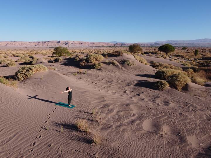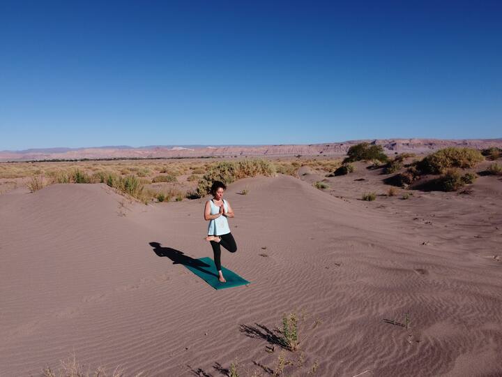 Clase grupal de yoga en el desierto. Pedaleada fácil y clase multinivel.
