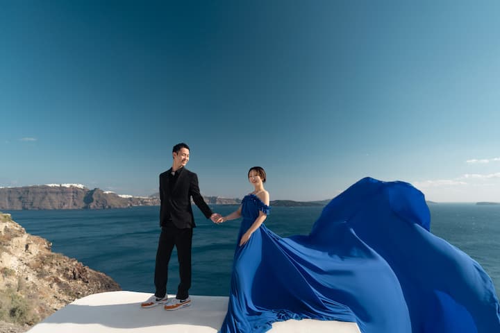 Me especializo en fotos espectaculares con vestidos voladores en Santorini.