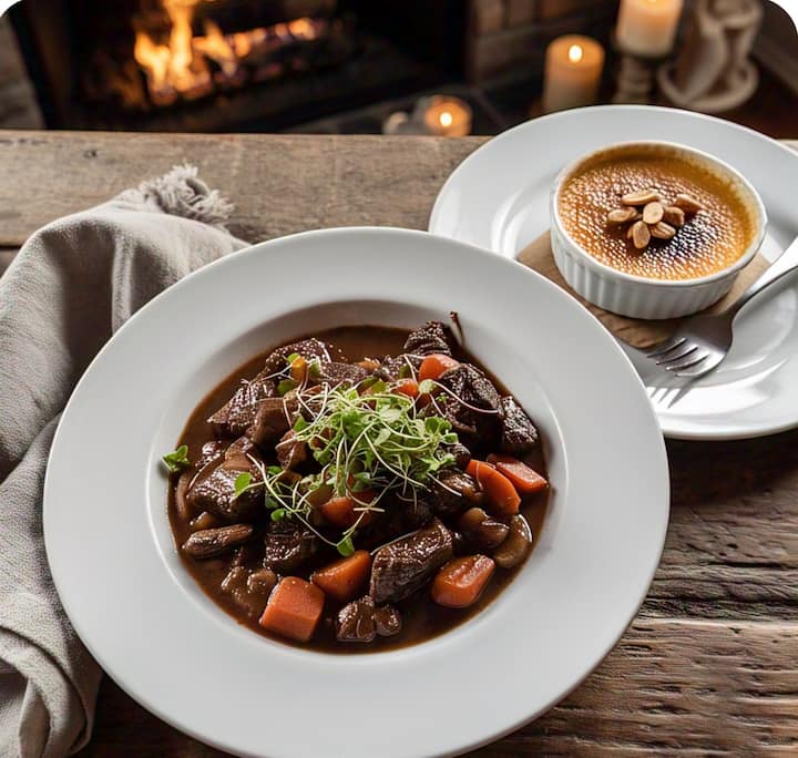 Recibe un bœuf bourguignon y una crème brûlée francesa a domicilio.
