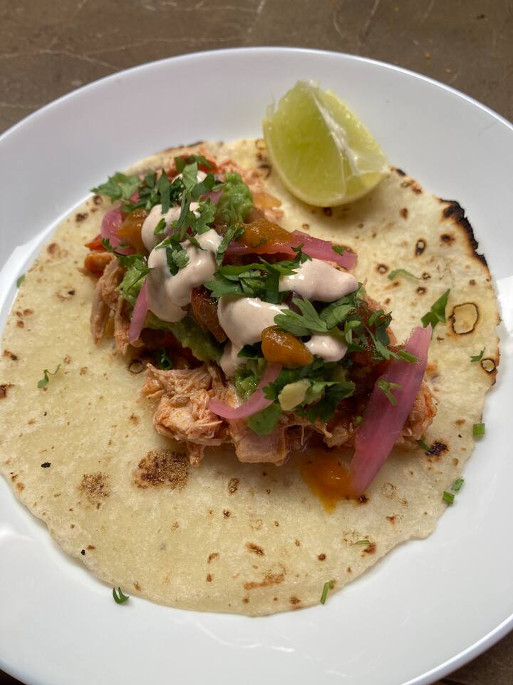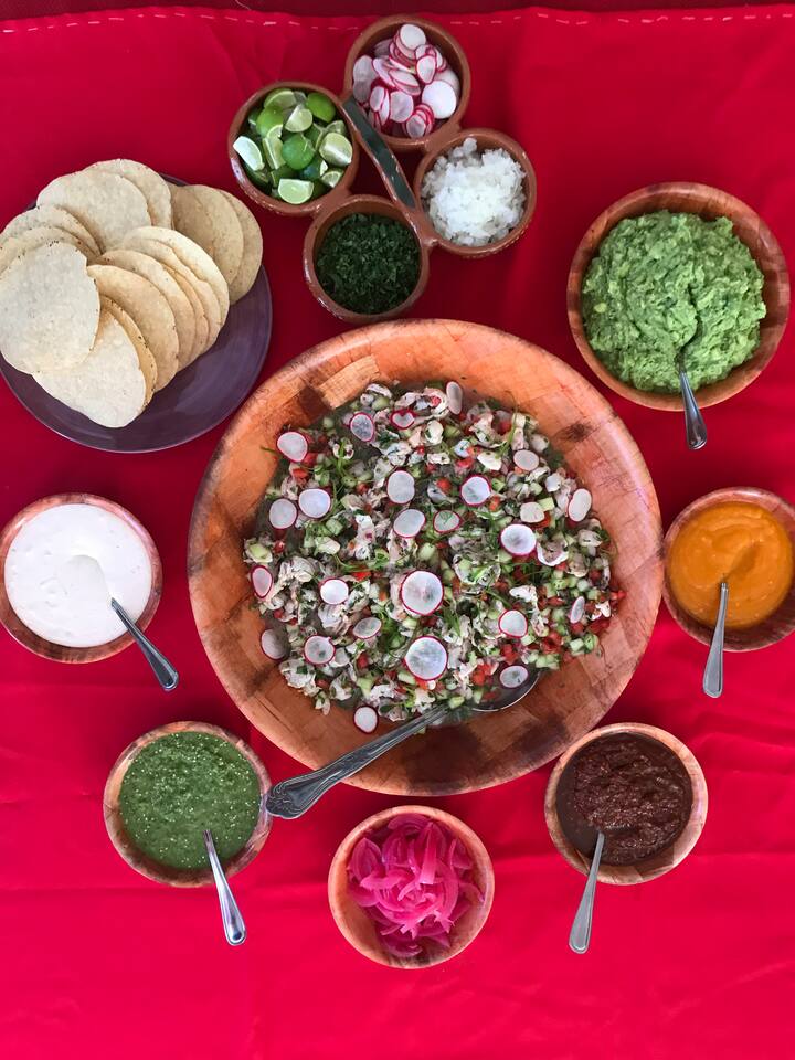 Sirve a tu grupo un bar de tacos con tostadas de ceviche de camarones y 2 tipos de proteínas para tacos, servidos con guacamole, salsas, crema de chipotle, cebollas, cilantro, limas y tortillas de elaboración local.