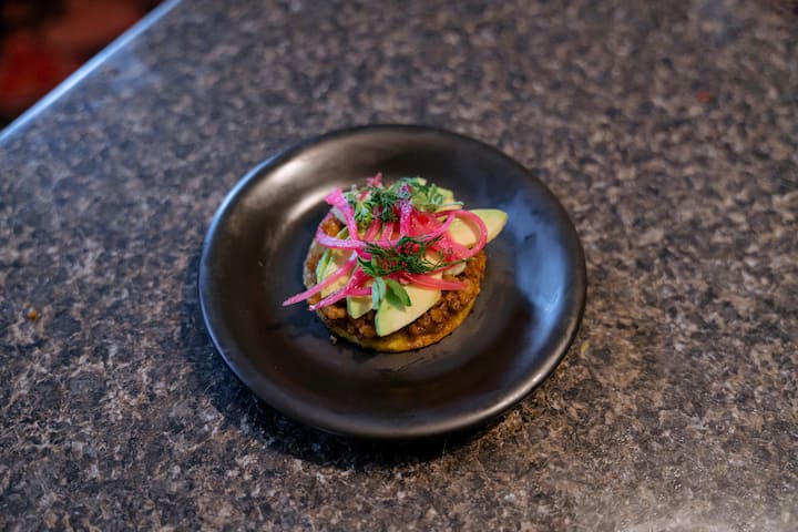 Un pequeño menú degustación con platos artísticos del tamaño de un bocado, sabores refinados y vajilla fina.