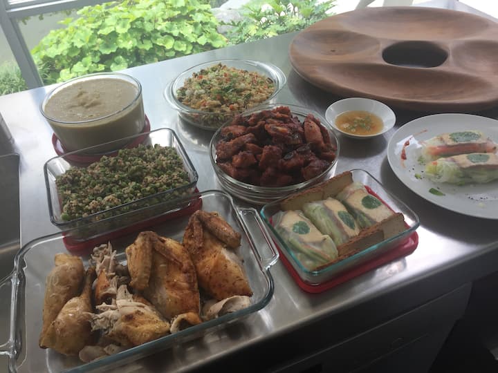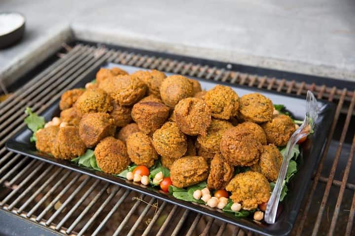 Sal con amigos y disfruta de esta cena de 3 platos con ensaladas frescas, salsas, brochetas a la parrilla y verduras.