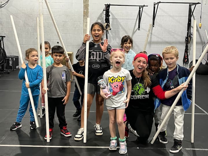 Una clase para niños, centrada en el movimiento saludable en un ambiente divertido y de alta energía.