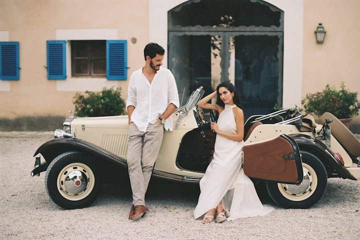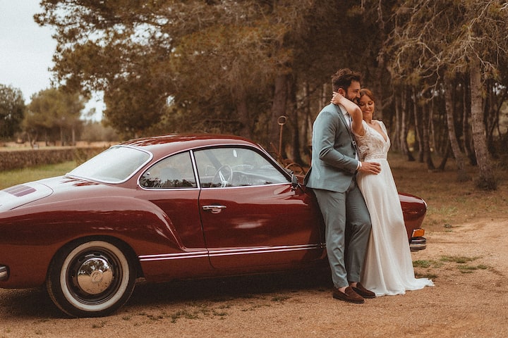 Preciosa sesión de fotos con un Volkswagen Karmann Ghia, uno de nuestros impresionantes coches clásicos en Mallorca. Incluye 10 fotos de alta calidad de la sesión.