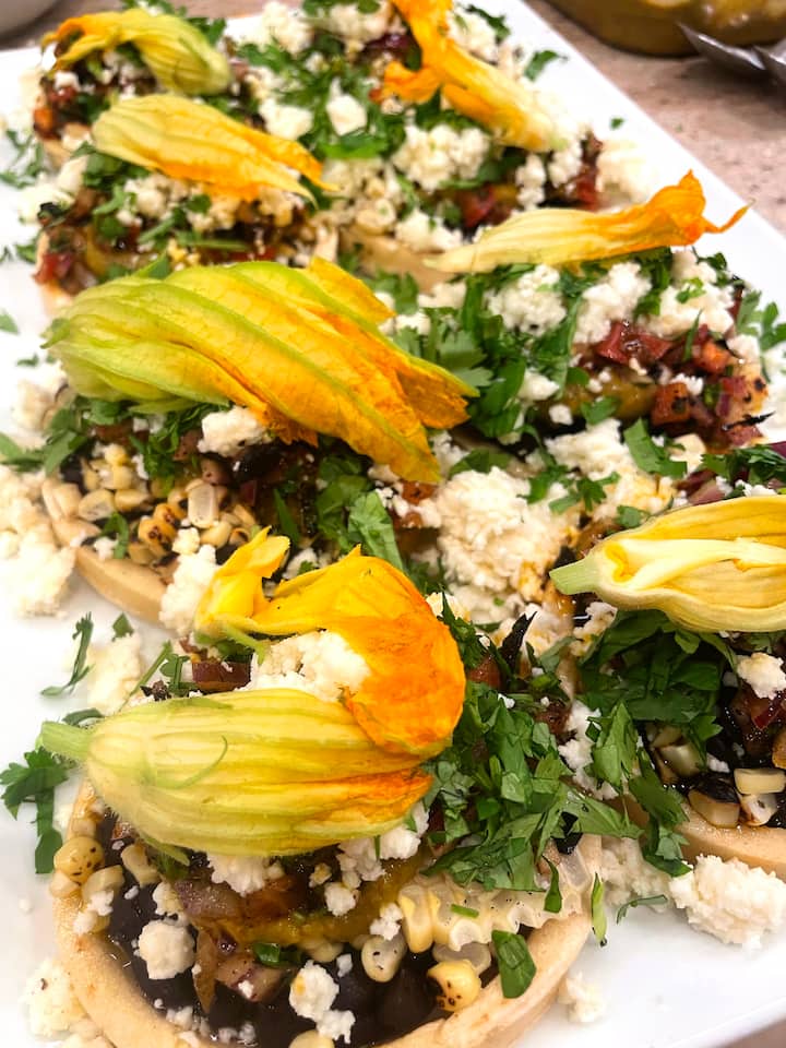 Sopes con queso fresco: tazas de masa mexicana rústica con queso de granja, chiles secos y maíz tostado.