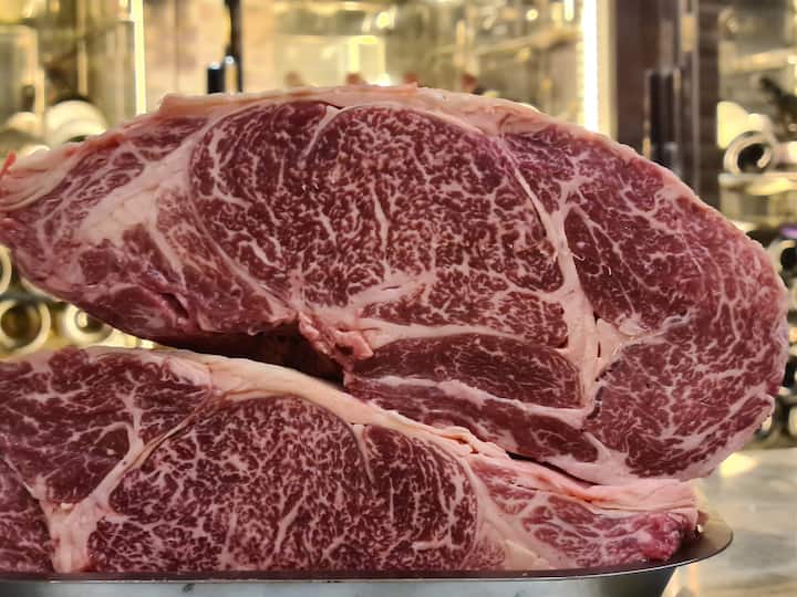 Degustación de carnes de wagyu ahumadas al fuego de leña. Hueso de caña con flor de sal, champiñones en persillade.