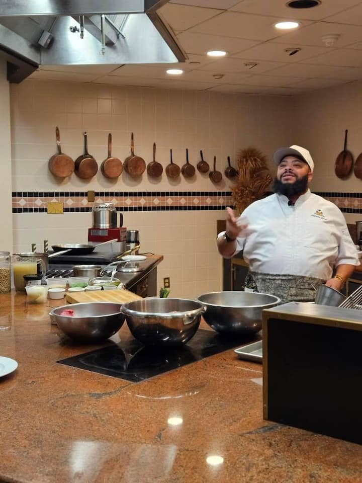 Una clase práctica de cocina haitiana. Los participantes preparan platos tradicionales y los disfrutan juntos.