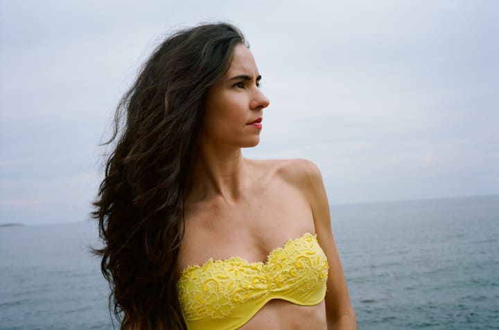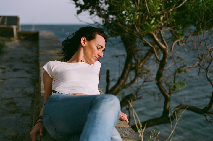 Sesión fotográfica en una cala paradisíaca con el mar turquesa de fondo. Incluye 10 fotos editadas y accesorios locales como sombreros y flores frescas.