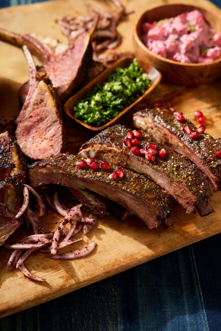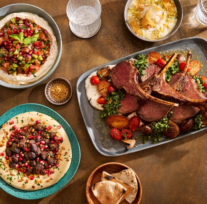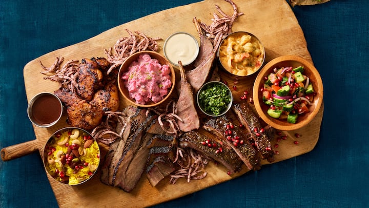 Barbacoa al estilo del centro de Texas con todos los acompañamientos en una bandeja perfecta. Elige entre tres carnes (cordero, falda de ternera, pollo y kofta) y tres de mis acompañamientos de autor, además de un postre de arroz con leche o pudin de pan egipcio.