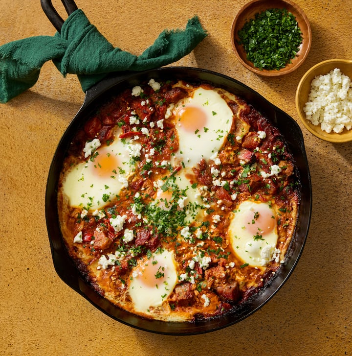 Empieza el día con una deliciosa selección de platos únicos para el brunch, como shakshuka de falda de ternera, salmón curado con remolacha y tostadas francesas con sésamo y pistacho.