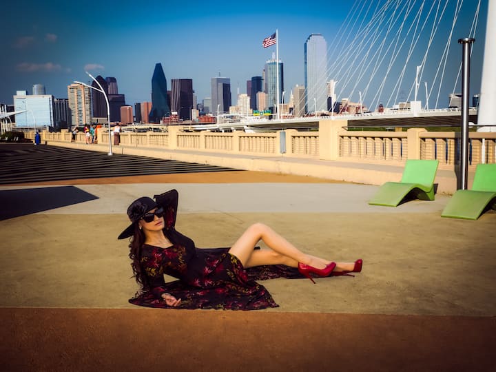 Sesión de fotos de estilo de vida o de perfil en el estudio o en el distrito de diseño de Dallas, el distrito de arte de Dallas o el puente Margaret Hunt Hill al atardecer.