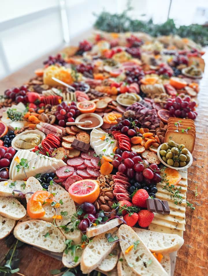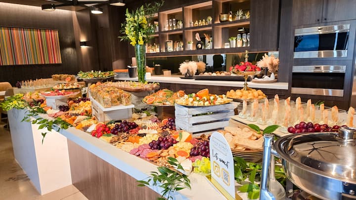 Embutidos, quesos, frutas, ensalada caprese, ensalada de pasta, galletitas saladas, pan, salsas y cremas para untar. Para un mínimo de 25 personas.