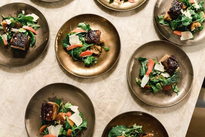 Disfruta de una comida de varios platos con servicio completo para ocasiones especiales, que incluye un aperitivo, una ensalada y pan, un plato principal y un postre.