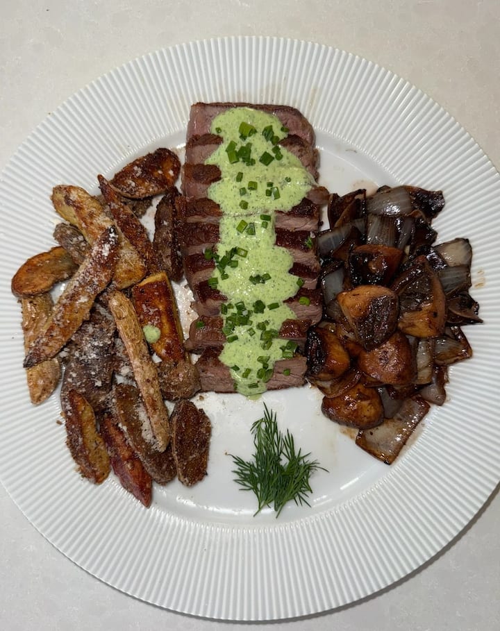 Cuenta con sous vide filete con salsa de hierbas y ensalada César.