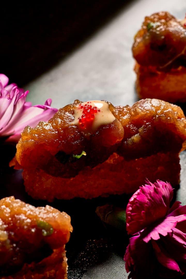 Elegí una comida de estilo omakase con pez limón, patudo, vieiras, tiraditos, tartares y arroz crujiente. Esta presentación en vivo presenta platos que están bellamente emplatados y llenos de sabor.