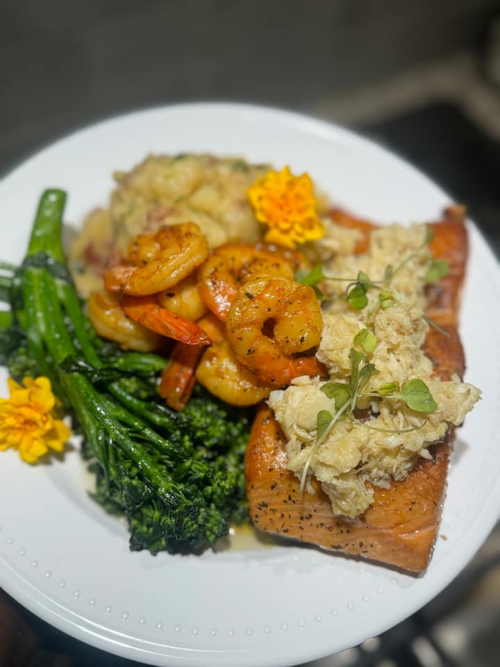 Salmón dorado cubierto con carne de cangrejo en trozos y salsa beurre blanc