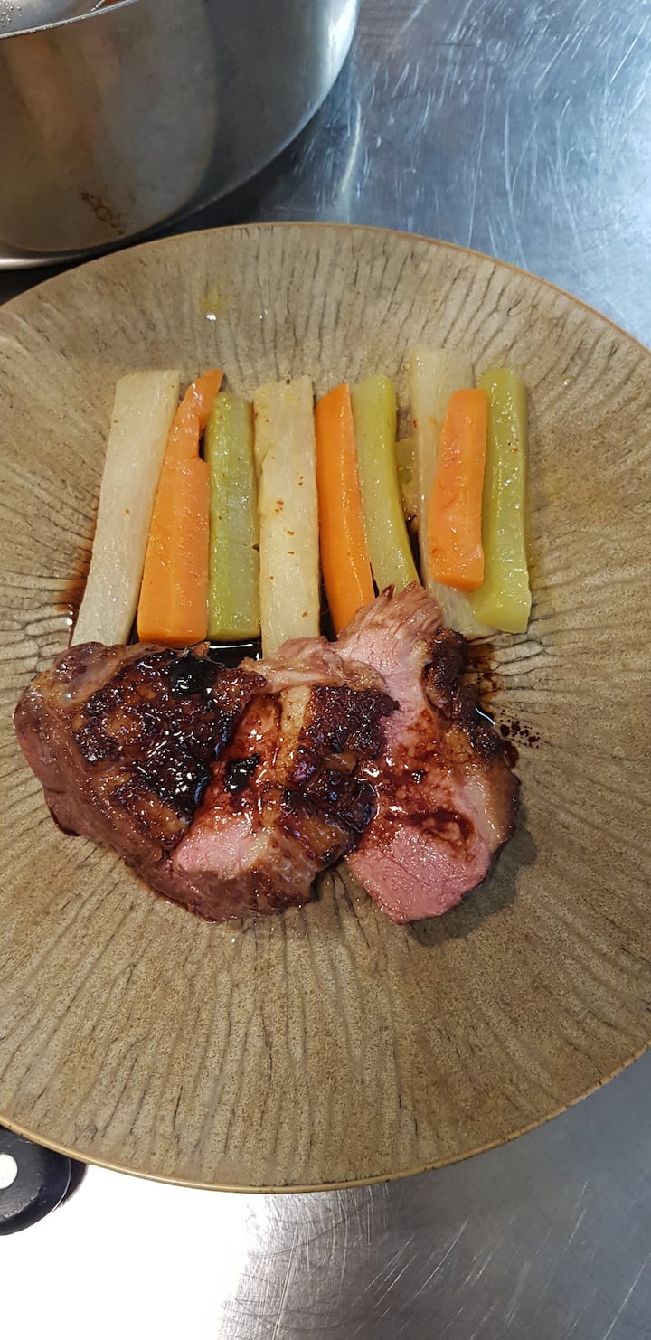 Este menú se compone según los deseos y la temporada, con ingredientes frescos inspirados en los mercados. Consta de aperitivos, entradas, platos y postres.