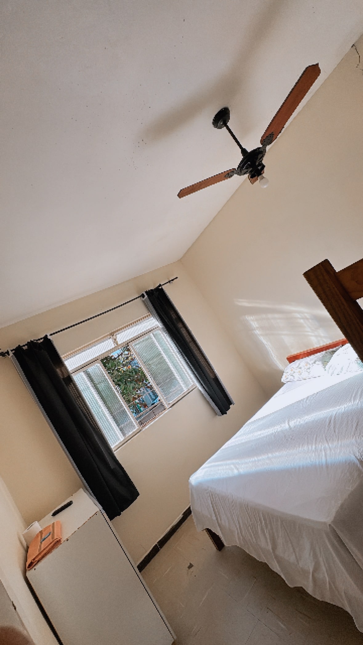 apartamento com 1 cama de casal no ar condicionado e 2 cama de solteiro no ventilador de teto.