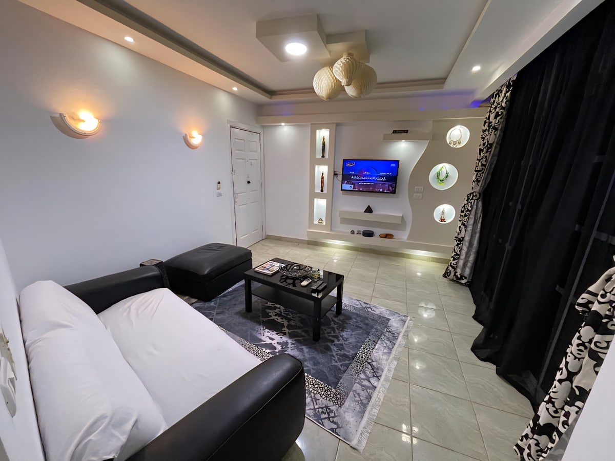 Moderno departamento de 60 m² en planta baja en el complejo familiar seguro Al Rabwa. Dormitorio espacioso, cocina abierta totalmente equipada y una cómoda sala de estar que se abre a un patio privado con vista a una pequeña pileta. Los huéspedes disfrutan de privacidad y comodidad, a solo 2 millas de Naama Bay, con sus restaurantes, cafés y vida nocturna. Las playas públicas y privadas están a poca distancia en taxi o transporte público. Perfecto para parejas o familias pequeñas que buscan comodidad, estilo y fácil acceso a las principales atracciones.