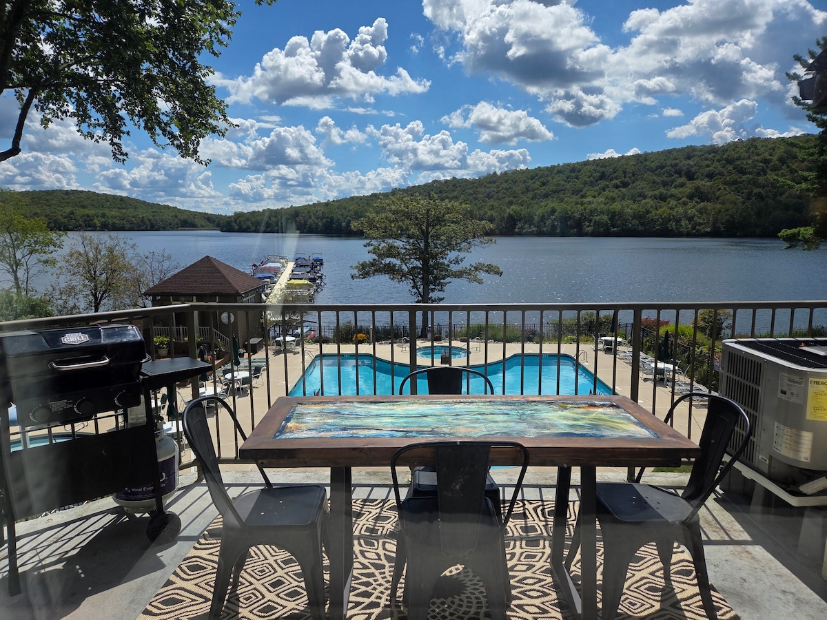 - 1er piso frente al lago en Big Boulder Lake. - Patio privado con fogata. - Piscina comunitaria con jacuzzi. - Dos SUITES PRINCIPALES. - Se aceptan estadías cortas. - Atracciones locales Jim Thorpe Pocono Raceway Parque acuático Split Rock Y más. - Gran golf. Jack Frost National Split Rock - Disfruta de la navegación , la pesca, el senderismo y mucho más. - Recorridos panorámicos y parques locales - Saludos a los restaurantes locales. - Estaciones de carga para vehículos eléctricos en el lugar. - Disfruta de todo lo que Poconos tiene para ofrecerte.