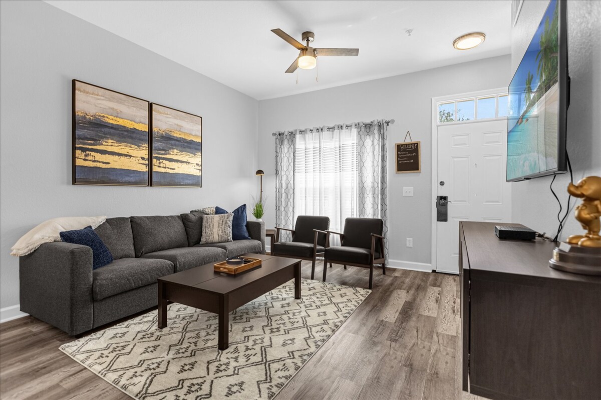 Nuevo apartamento bohemio y elegante de 2 dormitorios y 2 baños totalmente equipado. Vistas a la piscina para un máximo de 6 huéspedes. Ubicado en el complejo familiar Storey Lake Resort, a pocos minutos de Disney. El plano de planta abierta combina cocina, comedor, sala de estar con TV de 70 pulgadas y sala de relajación. La suite principal tiene una cama tamaño king y un televisor de 65 pulgadas. El segundo dormitorio tiene una cama tamaño queen y una cama individual con TV inteligente. Cerca de centros comerciales y tiendas minoristas. Parque acuático y servicios GRATUITOS: PISCINAS, ZONA DE CHAPOTEO PARA NIÑOS, TOBOGANES DE AGUA, RÍO LENTO, GIMNASIO, BAR TIKI, HELADERÍA y mucho más.