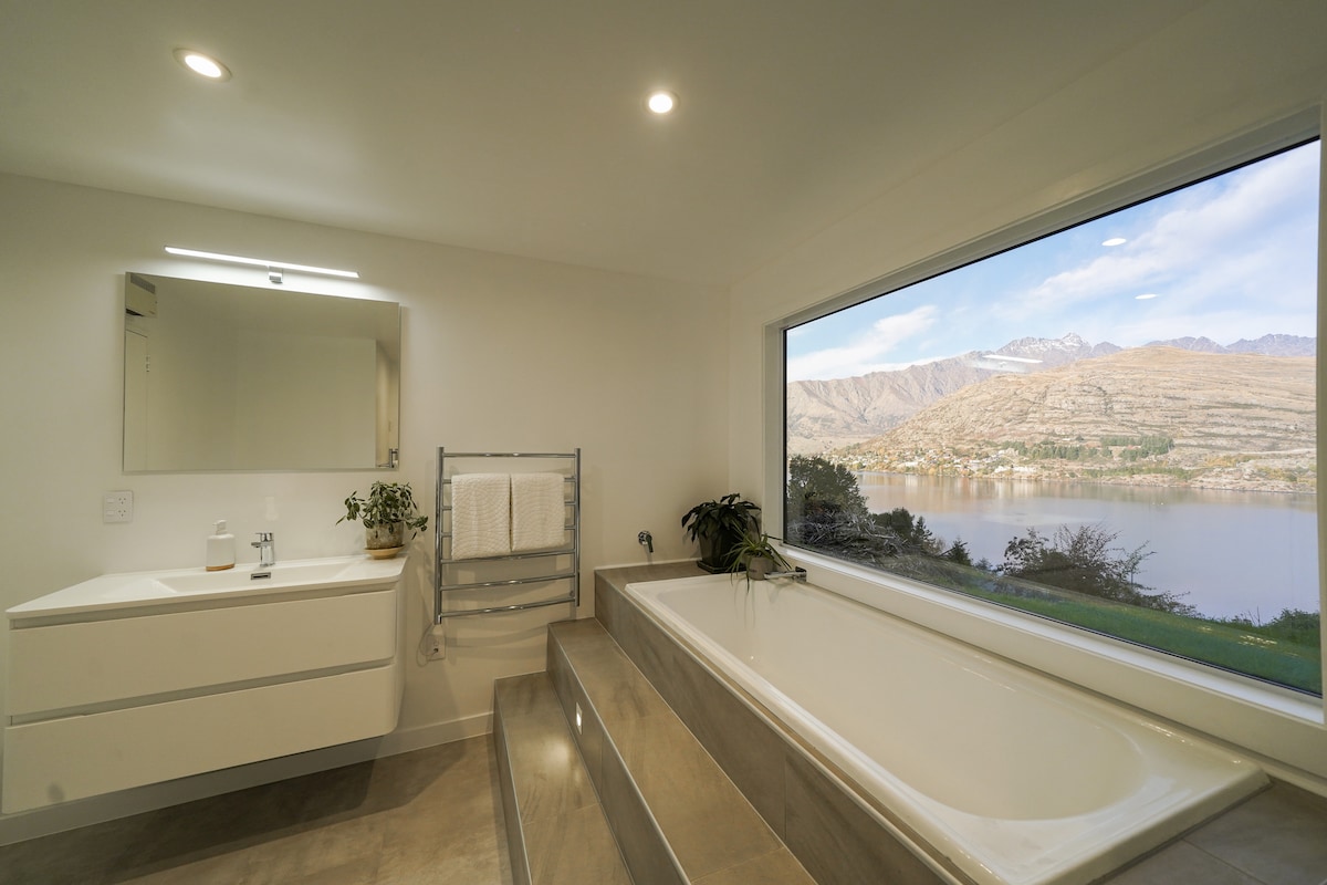 Relax and unwind. This luxurious place to stay is perfect for group trips. Incredible views on Fernhill. Less than 3km to the centre of town. You'll be cosy with 2 fireplaces, underfloor heating and a hot tub spa pool. A sauna is also available on request. Main space has open plan kitchen, living and lounge. On this level are 2 large bedrooms and a fully tiled marble bathroom. One queen bed and cot, other room either super king or two king singles. Huge ensuited master room downstairs