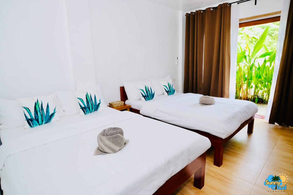 🌤️ Sunny Cloud Siargao ofrece 6 habitaciones tranquilas en el corazón de Siargao, cada una con 2 camas dobles y baño privado. Ubicado en Poblacion 5, General Luna, Isla de Siargao. Estamos a solo 5 minutos de Tourism Road y a 50 metros de la autopista, tranquilos pero a poca distancia a pie de bares y restaurantes. Rodeado de vegetación junto a una colina cubierta de árboles, nuestro alojamiento ofrece un gran cenador de 2 pisos con cocina compartida, congelador, utensilios y amplio estacionamiento. ¡Un alojamiento tranquilo y relajante con fácil acceso a todo lo que ofrece Siargao!