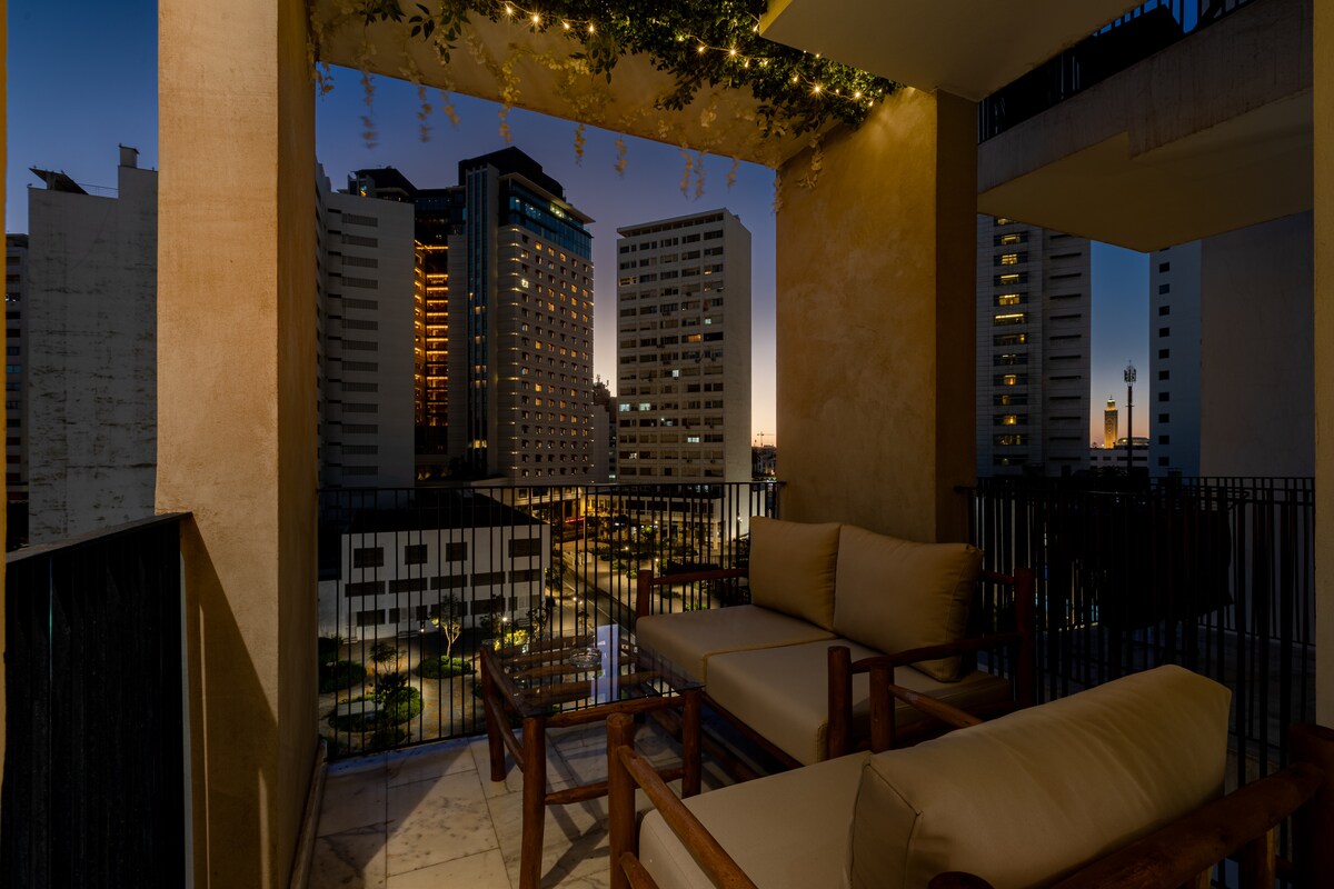 Departamento luminoso y moderno, ideal para parejas, familias o grupos pequeños de hasta 4 huéspedes. Cuenta con 2 dormitorios, 2 baños y un amplio salón de planta abierta que fluye a la perfección hacia una gran terraza con una vista panorámica abierta, perfecta para relajarse o cenar al aire libre. Ubicado en el corazón de Casablanca, cerca de la Marina, la Antigua Medina, el Mercado Central y la Mezquita Hassan II, ofrece comodidad, tranquilidad y una base ideal para explorar la ciudad.