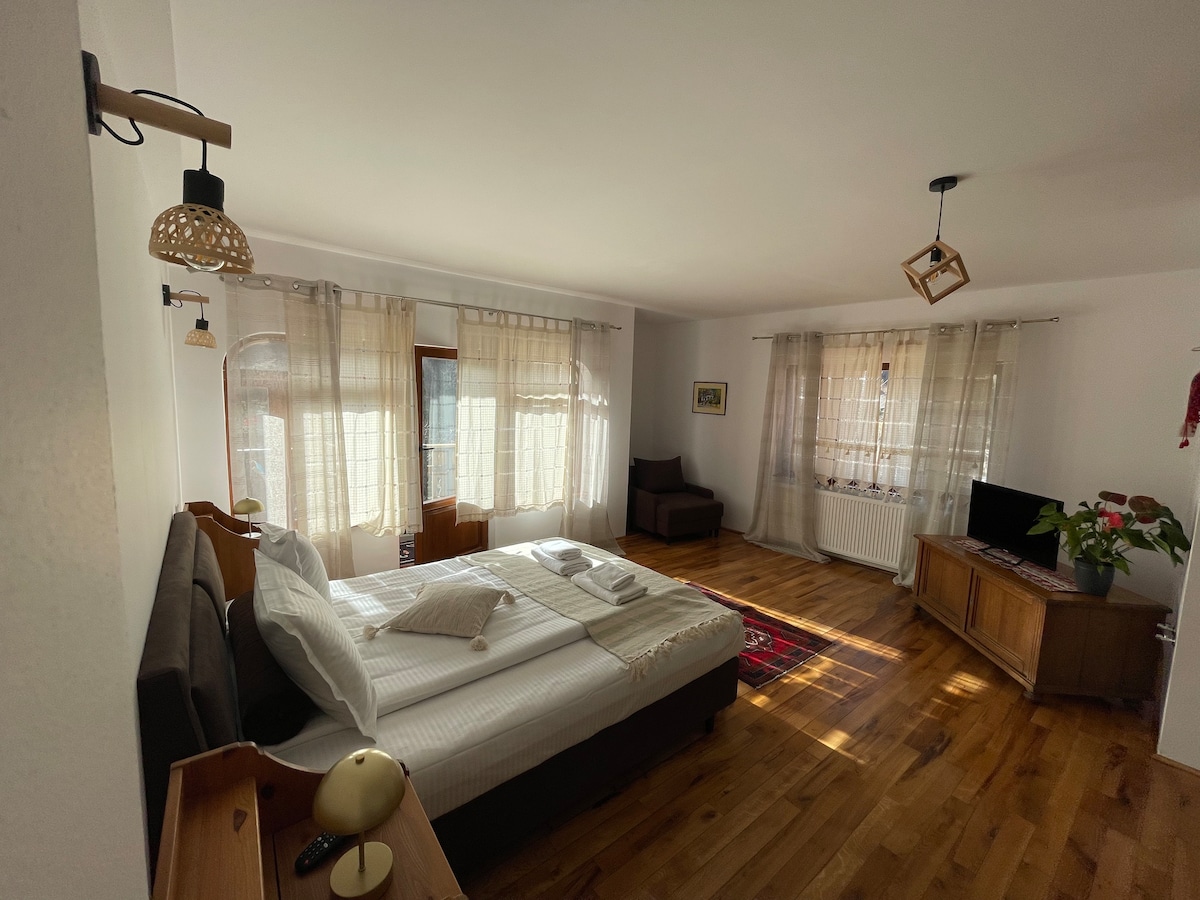 WOOD Studio está en una zona muy tranquila, a unos 1 km del castillo de Peles y a 15 minutos a pie del centro de la ciudad. El estudio tiene un diseño especial, diseñado para unas agradables vacaciones de una pareja o una familia con 1 niño. La propiedad tiene WIFI y NetFlix, cocina equipada con nevera, microondas y cafetera espresso, televisor inteligente, calefacción central propia, estacionamiento en la calle. Cerca de la propiedad se puede optar por el senderismo, la bicicleta de montaña o el esquí