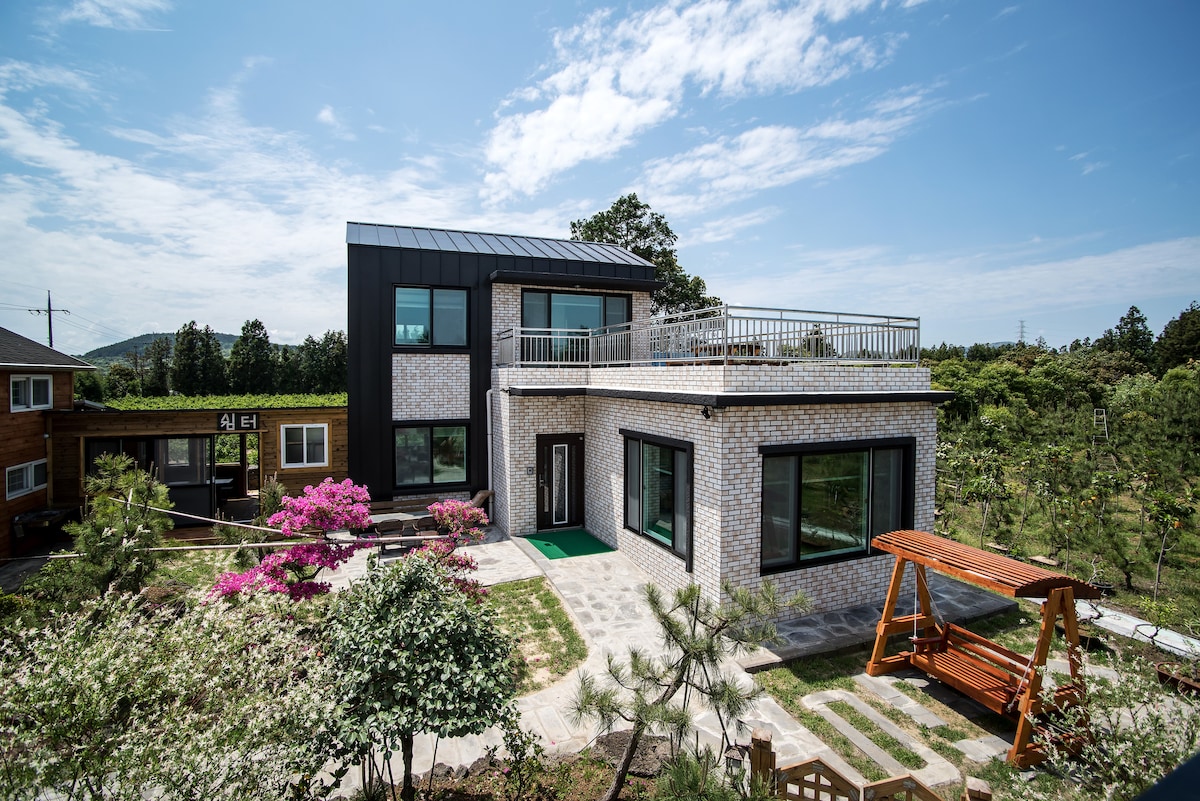 Entre el mar y el bosque de bambú, la casa donde se aloja nuestra familia (Abierto el 25 de agosto) Jeju Seongsan Sinsan-ri, Es un lugar donde el mar azul y el susurro del bambú conviven. Tenemos un refugio tranquilo solo para tu familia. Vista al mar justo frente a vos desde ◎ todas las habitaciones No importa si estás en el dormitorio o en el living, Podés disfrutar de la vista del mar frente a la montaña Seongsan. Desde la parte de atrás, un tranquilo muro de piedra y un bosque de bambú flotando en la brisa, para que puedas disfrutar de la tranquilidad que no se siente en la ciudad. Un espacio optimizado para familias ◎numerosas y parejas Bajo el magnífico techo a dos aguas de madera, la composición de los tres dormitorios y el amplio living, Está diseñado para ayudar a las familias a disfrutar de una estadía relajada. ◎ Descanso, sensibilidad y actividades relajantes Música analógica en un tocadiscos Una tarde de ocio con un cómic lleno de estanterías Incluso una ceremonia del té donde podés compartir tazas de té aromáticas Relajate a tu propio ritmo. - Opciones de pago Jacuzzi 50 000 KRW Barbacoa de 30 000 KRW