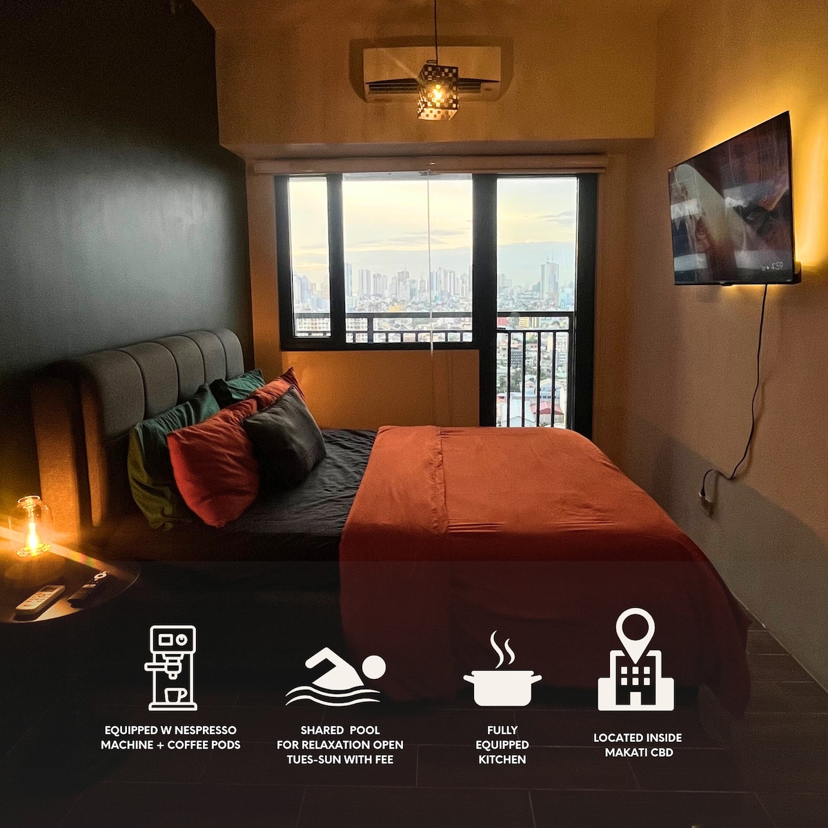 With 500MBPS WIFI in NEWLY Industrial stylish and classy AFFORDABLE AIRBNB condo at AIR RESIDENCES MAKATI the heart of Makati's business district. Enjoy city views from floor-to-ceiling windows, Netflix on a 60" TV, theres Nespresso machine with free coffee pods for you.The apartment features appliances, a hair dryer, electronic stove, iron, refrigerator, washing machine, toaster, microwave and shower with heater, a work/study area,highlight is the breathtaking view of high-rise buildings.