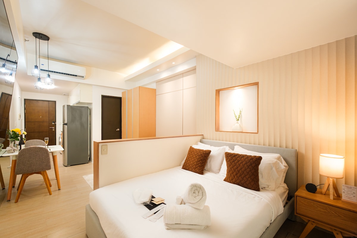 ¡Hola, bienvenido a AirJapandiMakati, tu hermoso hogar lejos de casa! ¡Disfruta de una elegante unidad de apartamento de 2 dormitorios totalmente amueblada e inspirada en Japandi en el corazón de Makati! Este lugar tiene poco más de un año y ha sido rediseñado profesionalmente para una estancia y una miniescapada perfectas. Ofrece una hermosa vista del horizonte de Makati desde tu dormitorio. Esta unidad cuenta con cocina americana totalmente amueblada, wifi de alta velocidad, TV inteligente de 43 pulgadas con Netflix, baño privado con calentador de agua caliente y bidé.