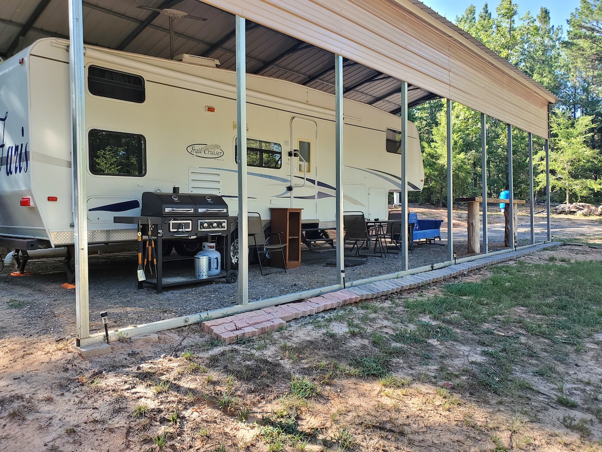 ~Easter Weekend Special~ Come enjoy beautiful and peaceful country living. Wake to the birds chirping. RV features one bedroom with a queen bed and a TV. The sitting area has a full-size pull-out bed and two recliners. There is another TV in the sitting area as well. 7 mins away from Walmart 15-20 mins from hospitals 30 mins from Broadway Square Mall 6 miles from Interstate 20 13 miles to Tyler State Park 9 miles to TJC 7.3 miles to UT Tyler Great husband and wife getaway.