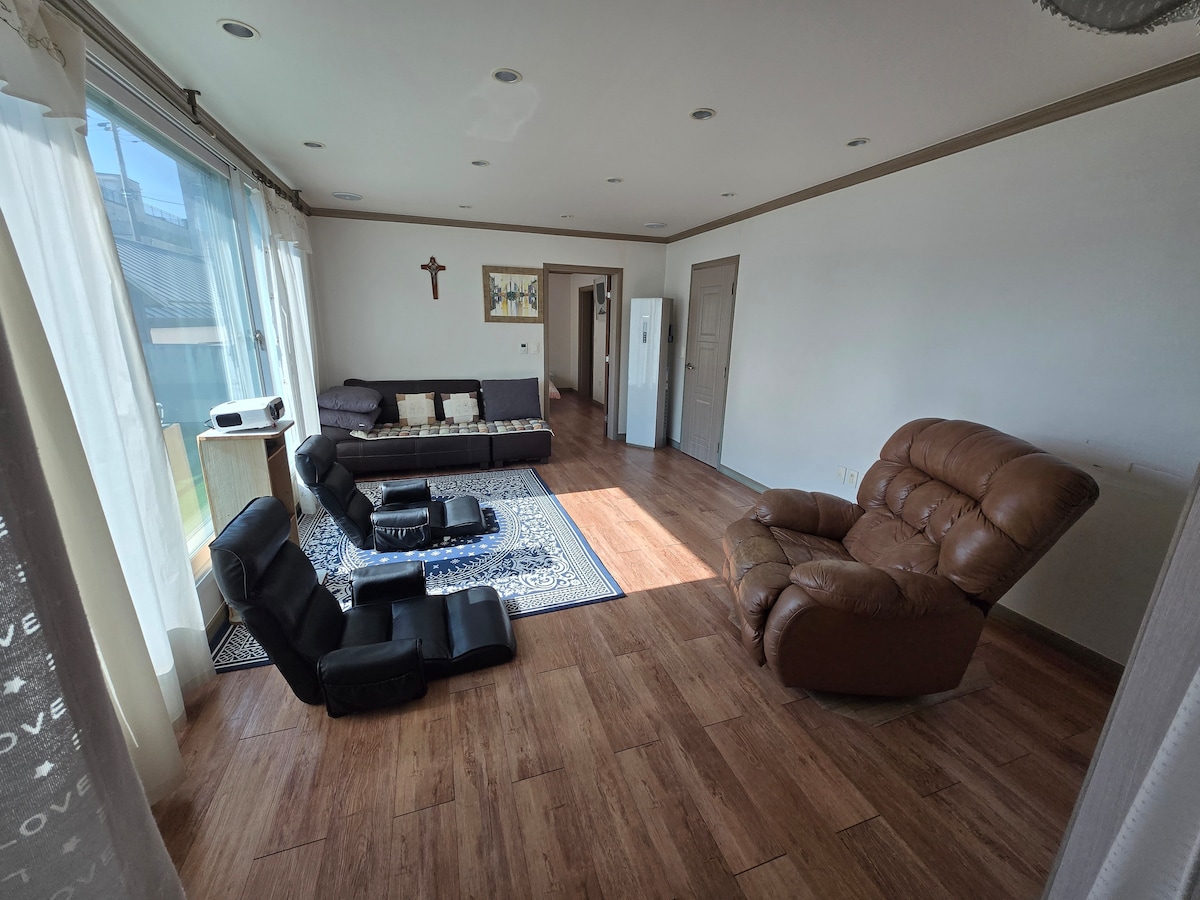 🌊 Residencia con vista al lago Cheongcho – Suite Royal de 3 habitaciones 🏖️ Suite exclusiva con vistas únicas del Mar del Este y el lago Cheongcho. Perfecta para familias. 🛏️ Cambiamos las sábanas después de cada estadía para garantizar que el espacio esté limpio e higiénico 💙 Se permite cocinar alimentos🍳 ligeros. Para alimentos de olor fuerte, use el 1F Cooking Studio (₩3000 por persona), equipado con vajilla. 💦 Los huéspedes pueden usar la pileta (cerrada de noviembre a abril) y la sauna de aguas termales (solo en Airbnb) de forma gratuita. Relajate y disfrutá de las vistas 🌅