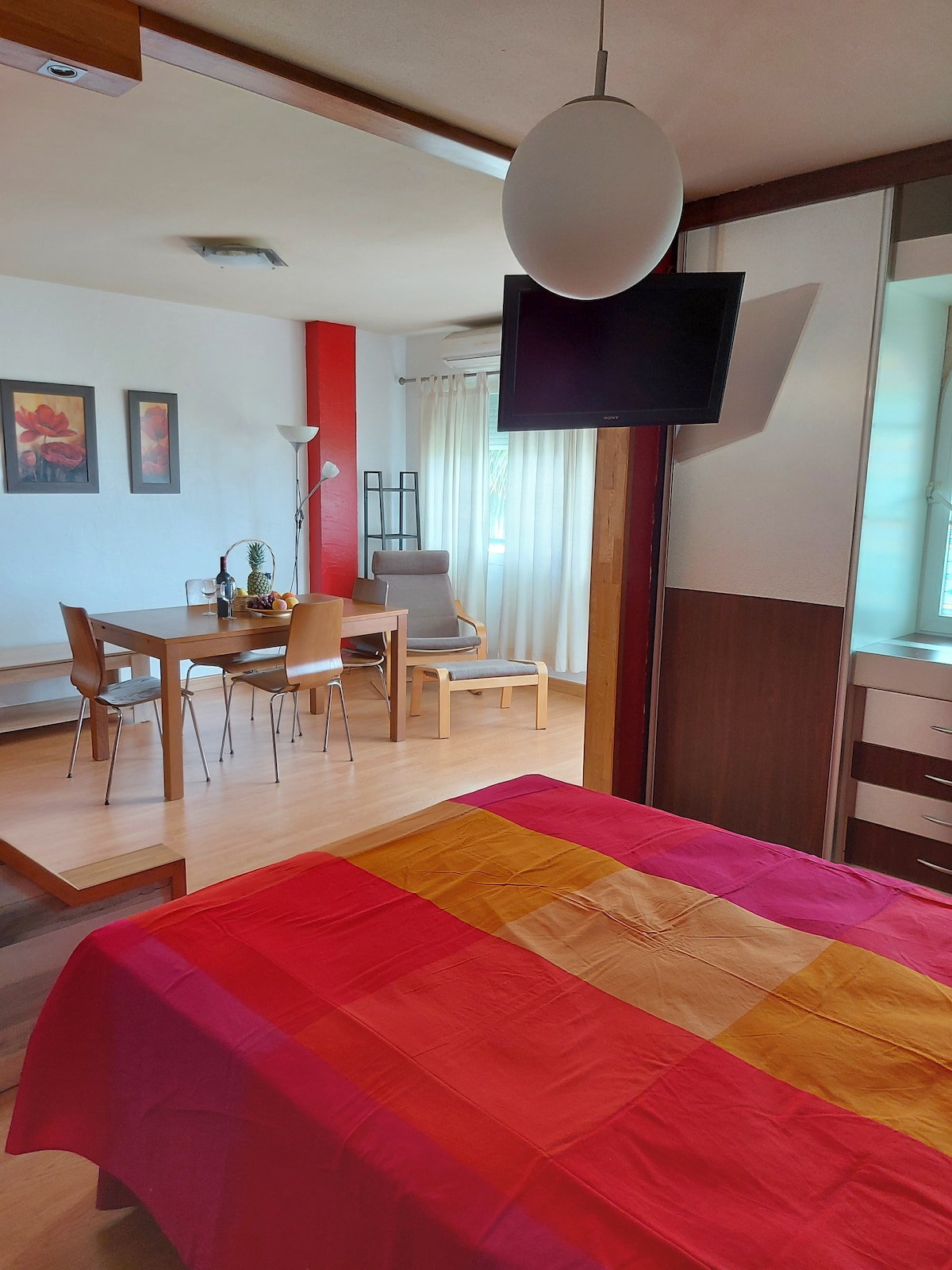 Este hermoso alojamiento está recién reformado, le hemos dado un toque personal y mucho cariño. Está situado a 200m de la playa, cerca de buenos restaurantes, chiringuitos, parada de autobús al frente y cerca del tren. Tiene wifi, aire acondicionado y un ventanal que se abre, quedando una terraza para que puedas disfrutar de una maravillosa vista del mar. El edificio es tranquilo, familiar, con espacios verdes. Ideal para desconectar o seguir conectado teletrabajando.