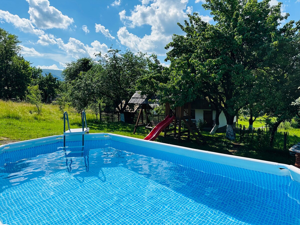 Casa dúplex del autor con su propia pileta. La casa tiene capacidad para 5 personas y está construida exclusivamente con materiales ecológicos, como arcilla y paja. Hay una terraza cerca de la casa de campo, en el patio hay una parrilla, un columpio, una hamaca, un parque infantil. Ubicado en el pueblo de Solochyn, a 7,5 km del centro y de la estación de ferrocarril de la ciudad de Svalyava, a 1,8 km del sanatorio Flower Polonyny y a 600 m de la carretera Svalyava-Perechyn. El acceso es una calle pavimentada.