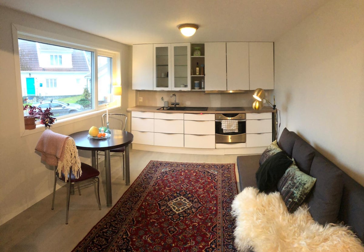 Estudio recientemente renovado con excelentes vistas y atardeceres. Ubicación atractiva en una zona residencial tranquila justo entre el centro de la ciudad de Kristians y la terminal de ferris y Dyreparken. A solo 10 minutos en auto. - Dormitorio con 1 cama doble. - Cama de huésped portátil, espacio para dormir en el sofá con colchón, cama de viaje para bebé (a pedido) - Abre la sala de estar/cocina con todos los accesorios. - Mesa de comedor para 4 personas. - Baño espacioso con cambio de espacio para bebés. - Patio con sol hasta las 10:15 p. m., hora de verano. Ropa de cama y toallas incluidas