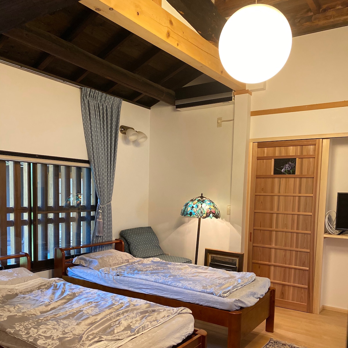 Nuestra casa es una casa tradicional de estilo japonés. Tiene 150 años y está en una ubicación muy tranquila. Estamos alquilando una casa. No se comparte con otros huéspedes. Hay 2 dormitorios (habitación Tatami) y 1 sala de estar, sala de juegos, baño, inodoro con ducha, todas las habitaciones son solo para ti. *Los niños no pagan si no necesitan cama y desayuno. Hay aire acondicionado en el dormitorio y en la sala de estar.