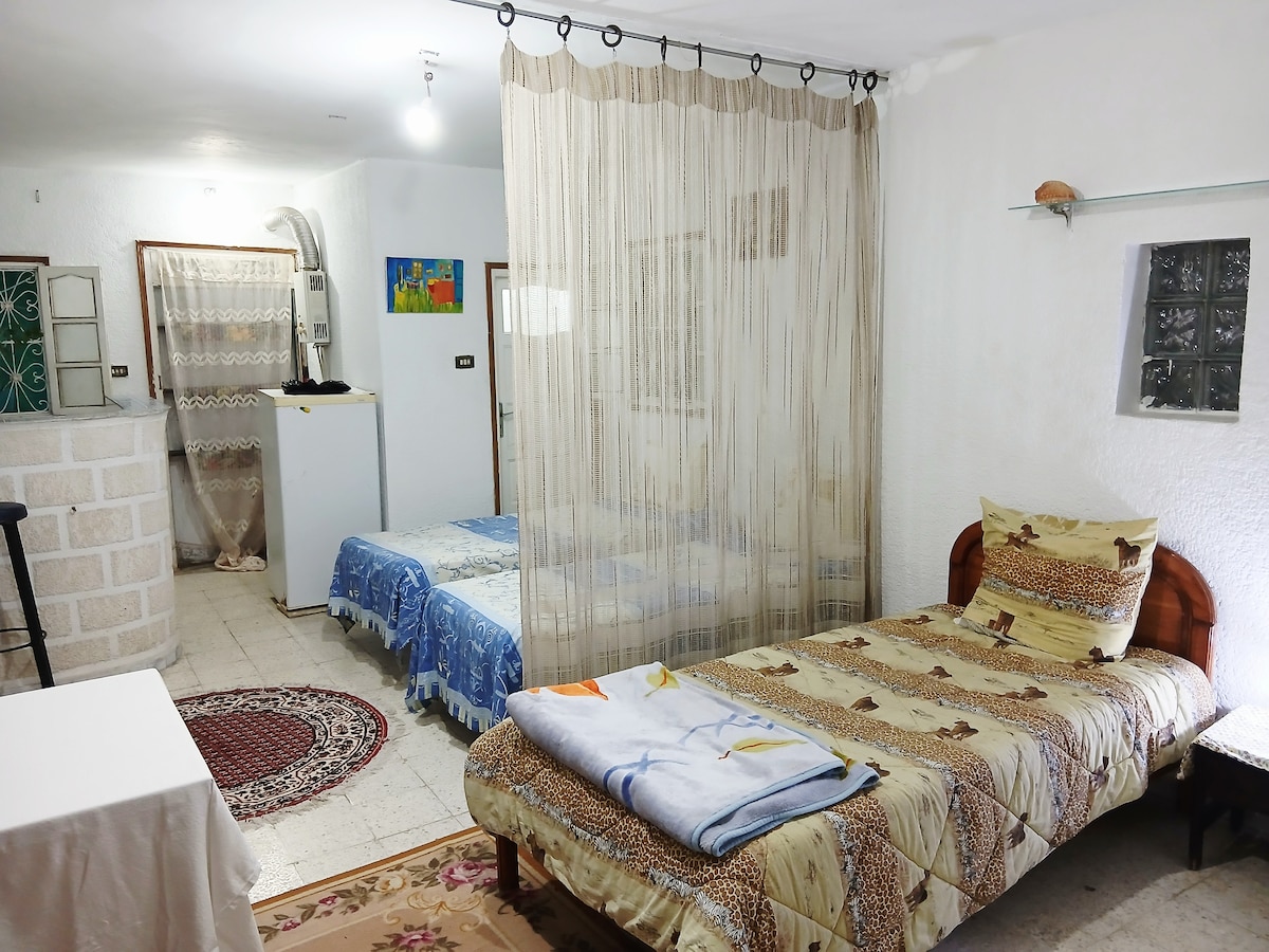 Welcome ! This listing offers a bed in a shared small studio with an independent entrance. This is not a private studio, please read the description carefully before booking. You will be sharing the studio with other potential guests, who are tourists like you. The studio is located on the ground floor, with a nice view of the garden. It is situated in a calm and very safe neighborhood, in a highly strategic area of Sousse, just an 8min walk from the Old Town. Wi-Fi up to 50 Mbps is available