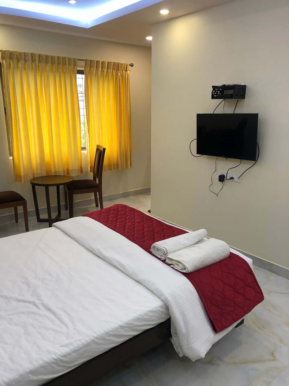 Primera planta, una habitación con aire acondicionado (cargos adicionales basados en el uso real de aire acondicionado) con 2 camas y colchón Sleepwell, con baño privado, agua caliente las 24 horas, batería de respaldo UPS solo para luces y ventiladores (durante aproximadamente 4 horas), wifi de fibra, nevera, pequeña cocina con cocina de GLP de un solo quemador, pocos utensilios, hervidor eléctrico, lavadora, punto de carga de vehículos eléctricos.