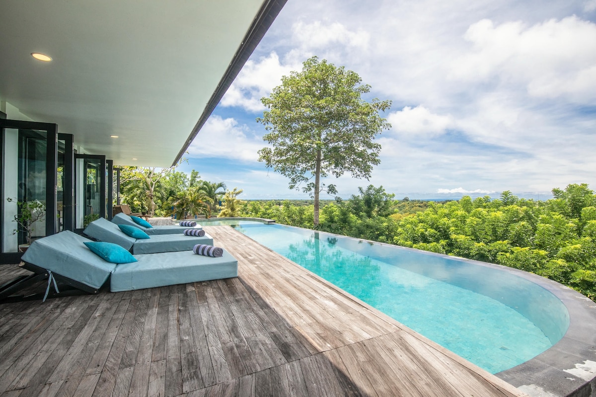 One-eighty-degree views stretch beyond a 60-square-meter pool at this traditional villa perched atop Jimbaran Hill. The verdant Bali countryside unfurls in front of an open-sided living area designed by prominent Indonesian architect Popo Danes and overseen by a full staff. Do laps in your own pool or make the 10-minute drive to swim, surf, and dine on seafood at Jimbaran Beach. During your holiday at The Longhouse, a chef, butler, and housekeeper will pamper you, and you’ll have private access to boutique-hotel-worthy amenities from an infinity pool and yoga area to a barbecue and al-fresco wet bar. This luxury property also features a home gym and spa area, plus a smart TV, surround-sound system, and Wi-Fi. The living areas at this vacation rental are set in an open-sided pavilion with a traditional alang-alang roof. Reconnect with friends and family around a dining table for 14, or catch up on reading in one of the quiet lounge areas. Though chef service is included in your stay, the villa does have a fully equipped kitchen. The Longhouse has 3 bedrooms with king beds, including one that feels like a honeymoon suite with its al-fresco shower and plunge pool. There are also 2 bedrooms with 2 twin beds each, and one bedroom with a queen bed. All 6 bedrooms have en-suite bathrooms. The villa’s location in the Kuta Selatan area gives you a taste of the real Bali. The closest town is Jimbaran, a 10-minute drive away, where you can spend a day on the white-sand beach, browse for the perfect souvenir in the shops, or join the locals in one of the many celebrations that still take place at the temple in front of the town’s market. For more restaurant options or a night out on the town, it’s a 30-minute drive to Seminyak. Copyright © Luxury Retreats. All rights reserved. BEDROOM & BATHROOM • Bedroom 1 - Bali: King size bed, Ensuite bathroom with bathtub and stand-alone rain shower, Alfresco shower, Dual vanity, Walk-in closet, Television, Safe, Desk, Air conditioning, Plunge pool, Balcony • Bedroom 2 - Sumatera: King size bed, Ensuite bathroom with bathtub and stand-alone rain shower, Walk-in closet, Television, Safe, Desk, Air conditioning, Private terrace • Bedroom 3 - Sumba: Queen size bed, Ensuite bathroom with stand-alone rain shower, Dual vanity, Walk-in closet, Television, Safe, Desk, Air conditioning, Direct access to terrace, Gazebo • Bedroom 4 - Lombok: King size bed, Day bed, Ensuite bathroom with bathtub and stand-alone rain shower, Alfresco shower, Dual vanity, Walk-in closet, Television, Safe, Desk, Air conditioning • Bedroom 5 - West Java: 2 Twin size beds, Ensuite bathroom with stand-alone rain shower, Walk-in closet, Television, Safe, Desk, Air conditioning, Direct access to terrace • Bedroom 6 - East Java: 2 Twin size beds, Ensuite bathroom with stand-alone rain shower, Walk-in closet, Television, Safe, Desk, Air conditioning, Direct access to terrace FEATURES & AMENITIES • Portable speaker • Spa space • More under “What this place offers” below OUTDOOR FEATURES • Yoga area STAFF & SERVICES Included: • Gardner • Pool attendant Extra Cost (advance notice may be required): • Activities and excursions • More under “Add-on services” below