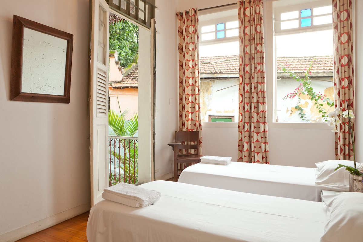 Magnífica habitación clásica en una impresionante casa de huéspedes histórica. Muy bien situado en el distrito artístico de Río. Cama tamaño king o dos camas individuales, aire acondicionado. Balcón. Baño grande, moderno y compartido. Jardín tropical. Servicio exclusivo y amable. Extra por desayuno 35 BRL pax/día