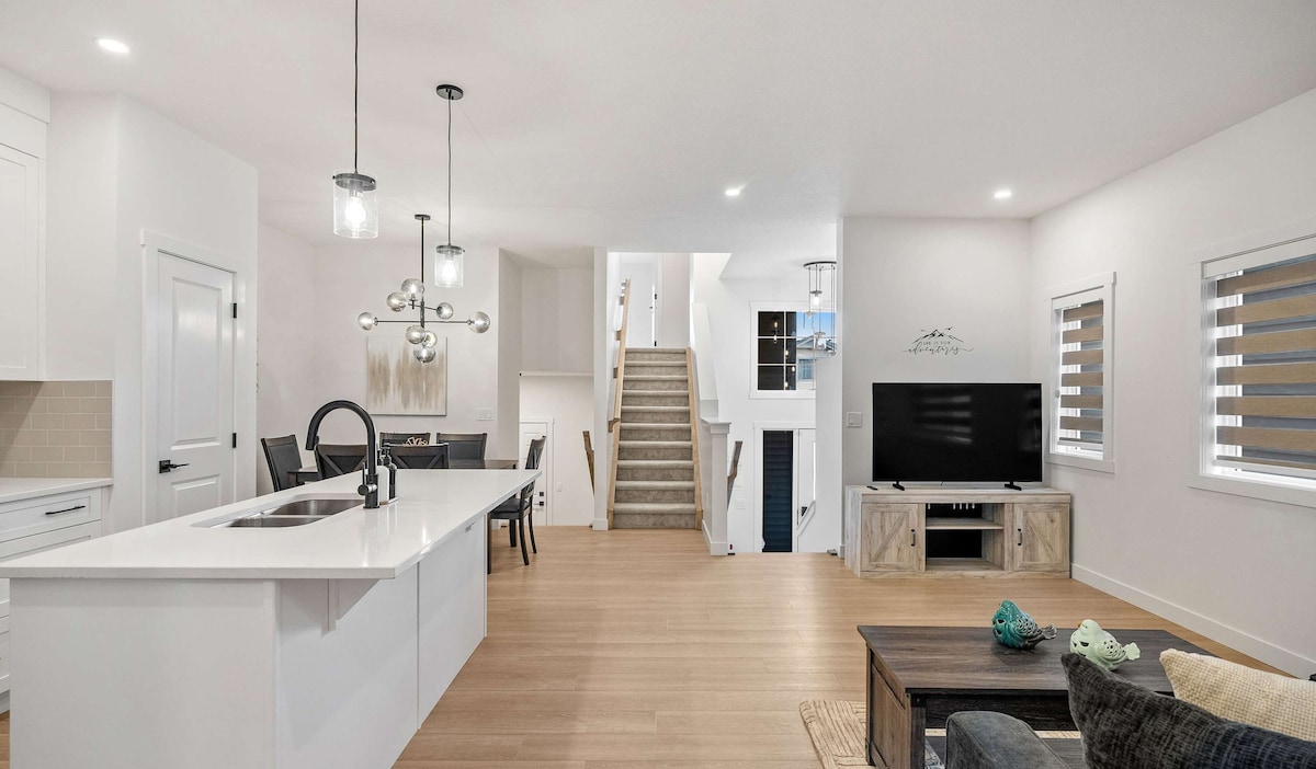 Welcome to a rare Calgary stay that blends the space of a multi-story townhouse with the flexibility of a private suite two units seamlessly combined into one stylish retreat. With 4 bedrooms, 3.5 bathrooms, and thoughtfully styled interiors in calming whites, greys, and teals, this home is perfect for families, groups, or long-stay travelers who value privacy, flow, and comfort. Located in a vibrant urban community, you'll enjoy clean design, luxury touches, and smart separation of space inclu