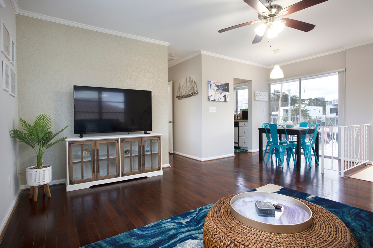 Beautiful 1 bedroom condo located directly on the intracoastal with a heated pool. This unit DOES NOT have water view from the condo BUT has amazing views of the intracoastal waterway from the patio/pool area. Enjoy watching the yachts sail by along with taking in amazing sunsets from the dock. Work from home, 1 block from the beach! Quiet and peaceful. Within walking distance to many shops and local amenities! Perfect for couples, young families and groups of friends traveling together.